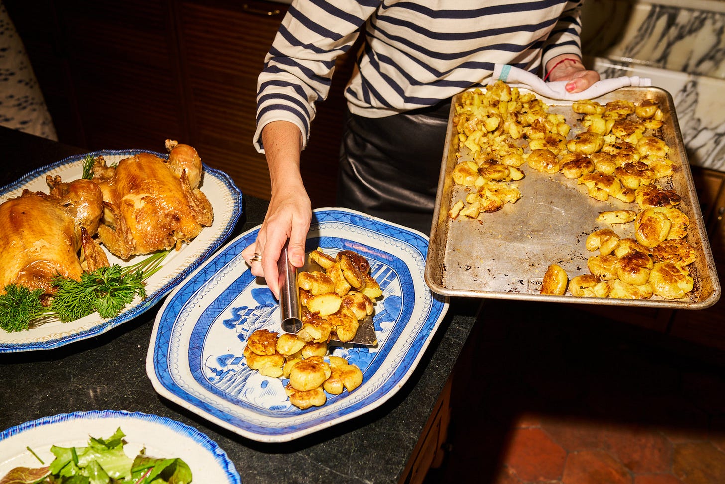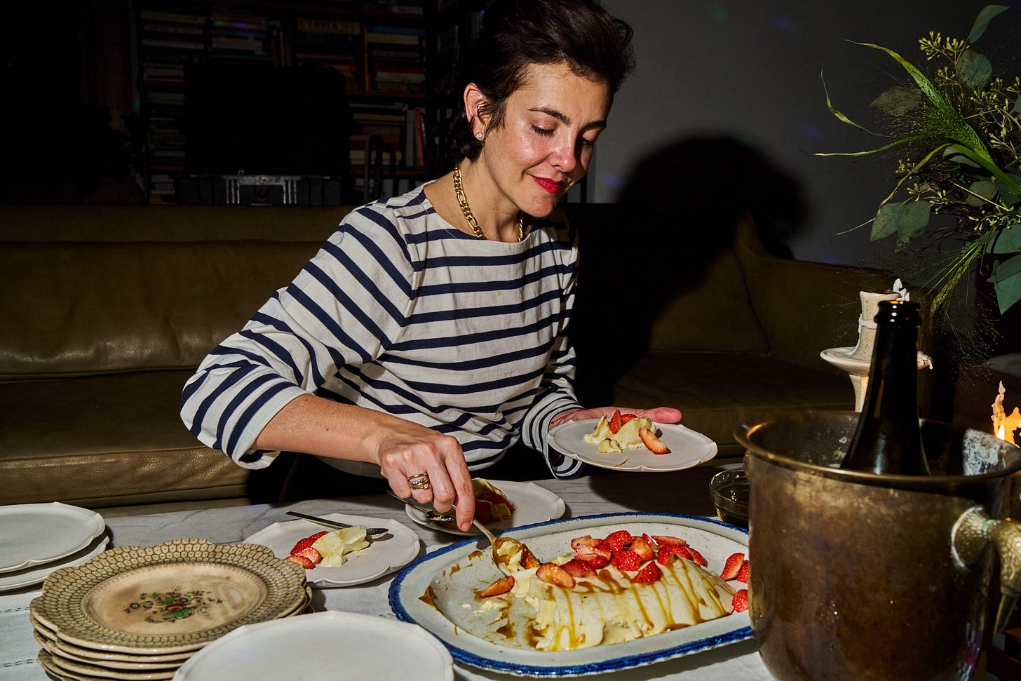 Mariana: Not putting on my shoes until the doorbell rings — so I can run around barefoot until the very last minute, tasting, lighting candles, moving flowers two inches to the left, then back again.