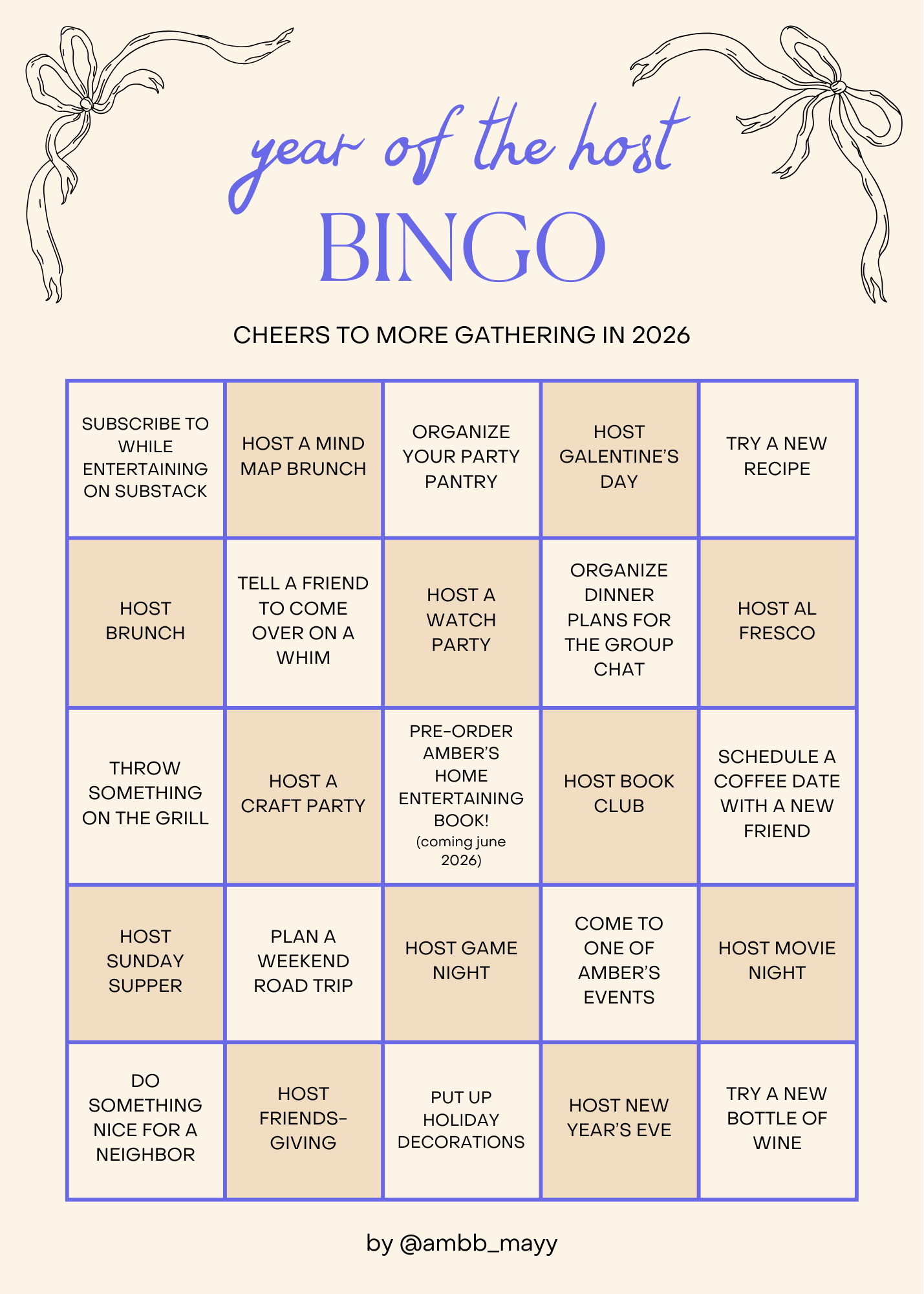 Right now, I want to speak directly to the hosts (seasoned and aspiring), the party planners, the gatherers of the group chat. I moved While Entertaining over to Substack for you. People like us, hosts, we are essential. We are the glue of our families and our communities. And we are the last defense against our generation’s loneliness epidemic. To kick off this new year, let’s make a deal. If you keep hosting, I will keep posting — information, inspiration, hacks, and how-tos to keep your cup full, and so you can fill the cups of those around you. No excuses, just good times. I’m declaring this the year of the host. Are you in? Keep scrolling for my 2026 hosting bingo challenge.